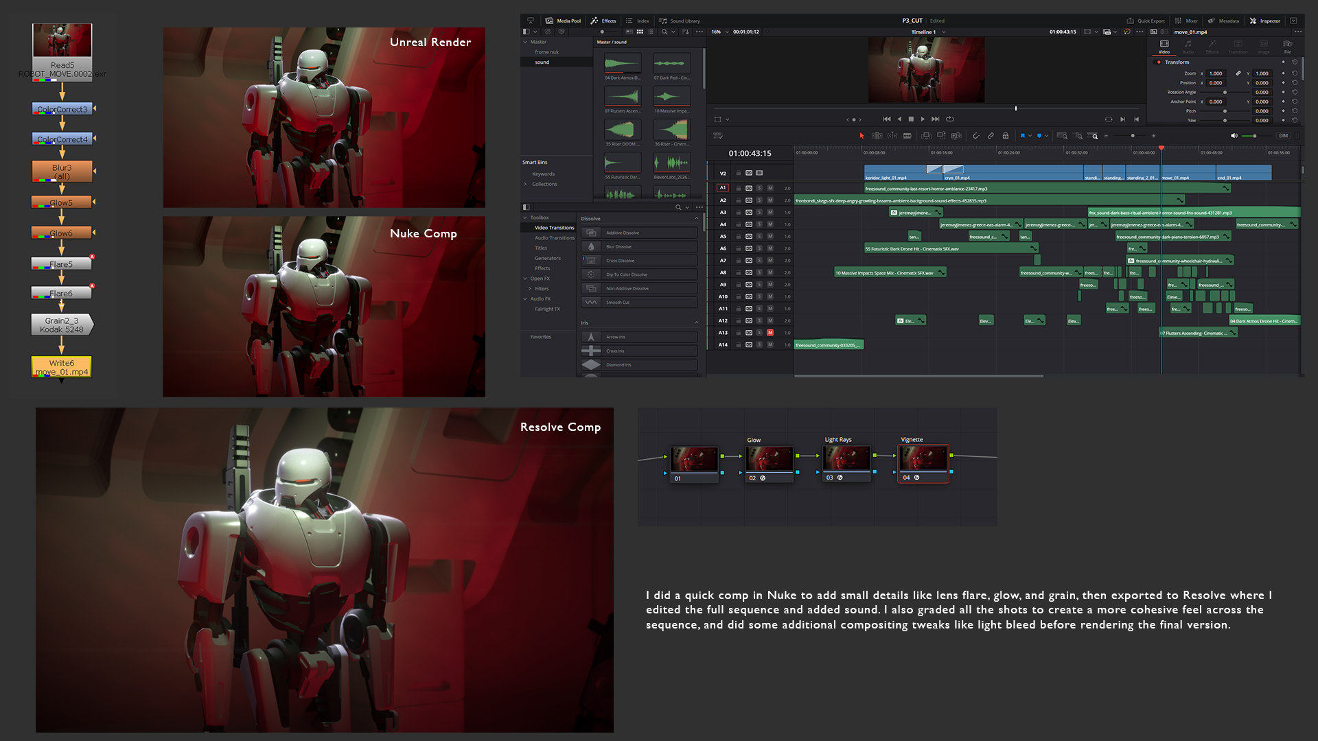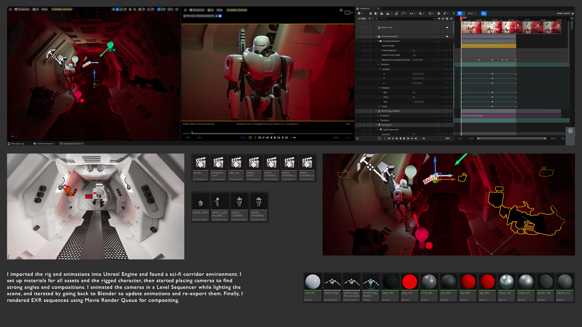 This project was part of a portfolio course where I rigged and animated a robot character in Blender and rendered the final sequence in Unreal Engine. From the beginning, the goal was to create a short, focused moment centered around the character.